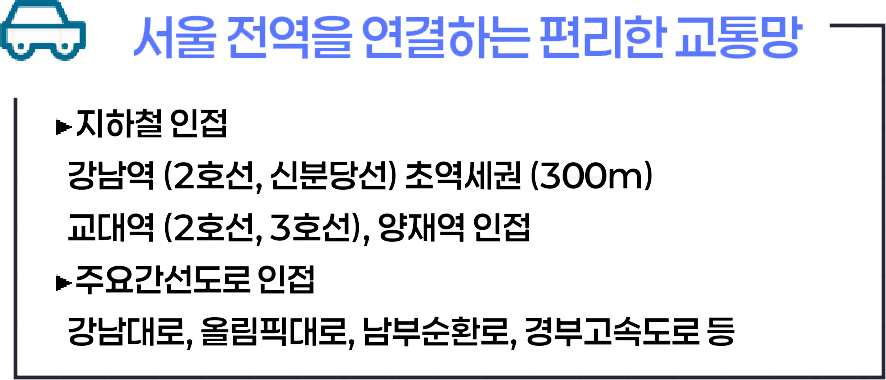 강남역(2호선, 신분당선) 300M 초역세권, 교대역/양재역 인접